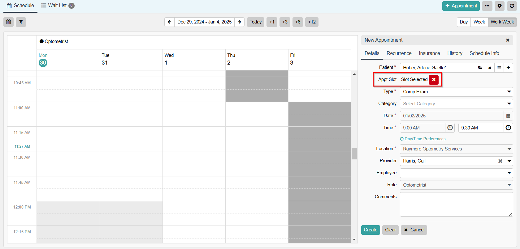 - Slot Selected displays within the New Appointment window, in the Appt Slot field. See Example