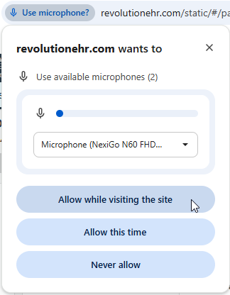 Important Note: Your browser may prompt you for permission to access your microphone when using RevolutionEHR. Select 'Allow while visiting the site' to avoid having to update this each time you use AI Scribe: