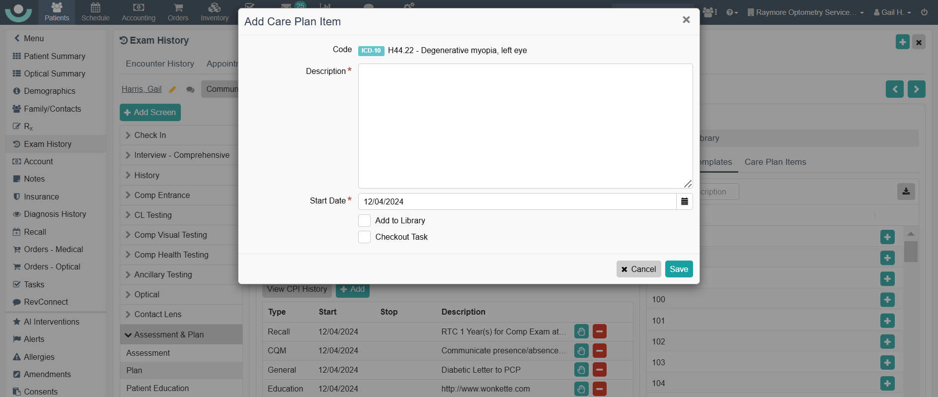 - In the Add Care Plan Item modal, complete the required fields. Note: The options to Add to Library and Checkout Task are available in this modal. See Example