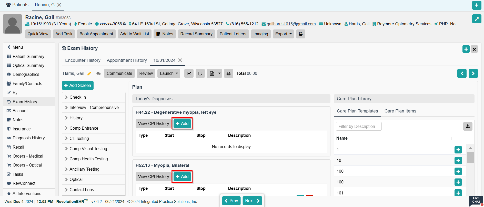 - Within the Today's Diagnosis section, below the diagnosis, click '+Add.' Note: If the encounter does not have a diagnosis assigned within the Assessment screen, a +Add button will not display. See Example