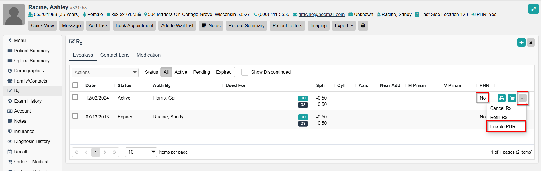 - Access Patients > search for and open a patient > Rx > select Eyeglass or Contact Lens tab.