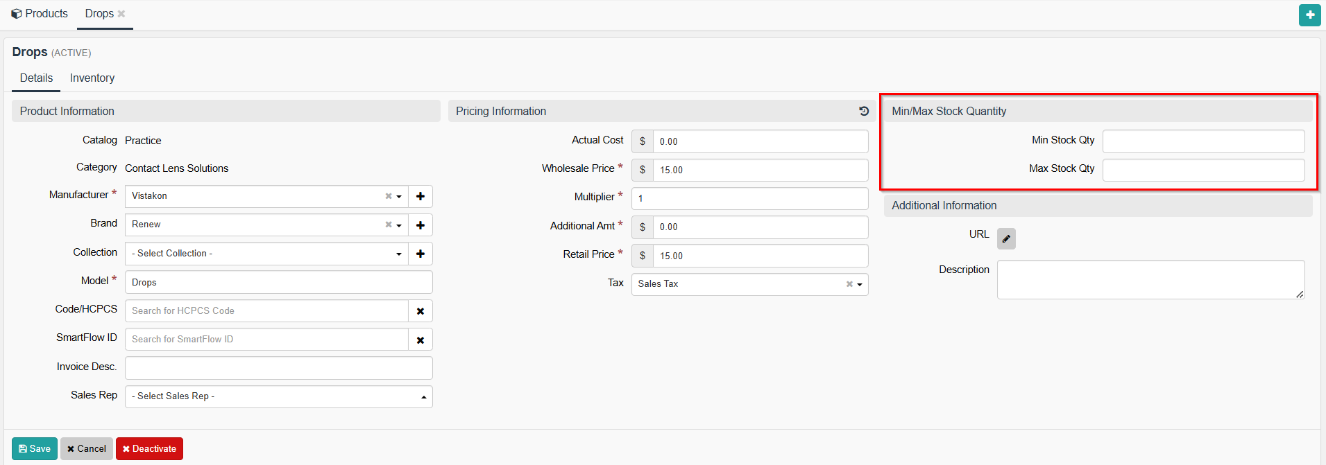 The Min Max Report displays the items within your physical inventory that have fallen below your Min Stock Qty. Note: Min and Max refer to the fields located within the Details of a product in your Products catalog. See Example