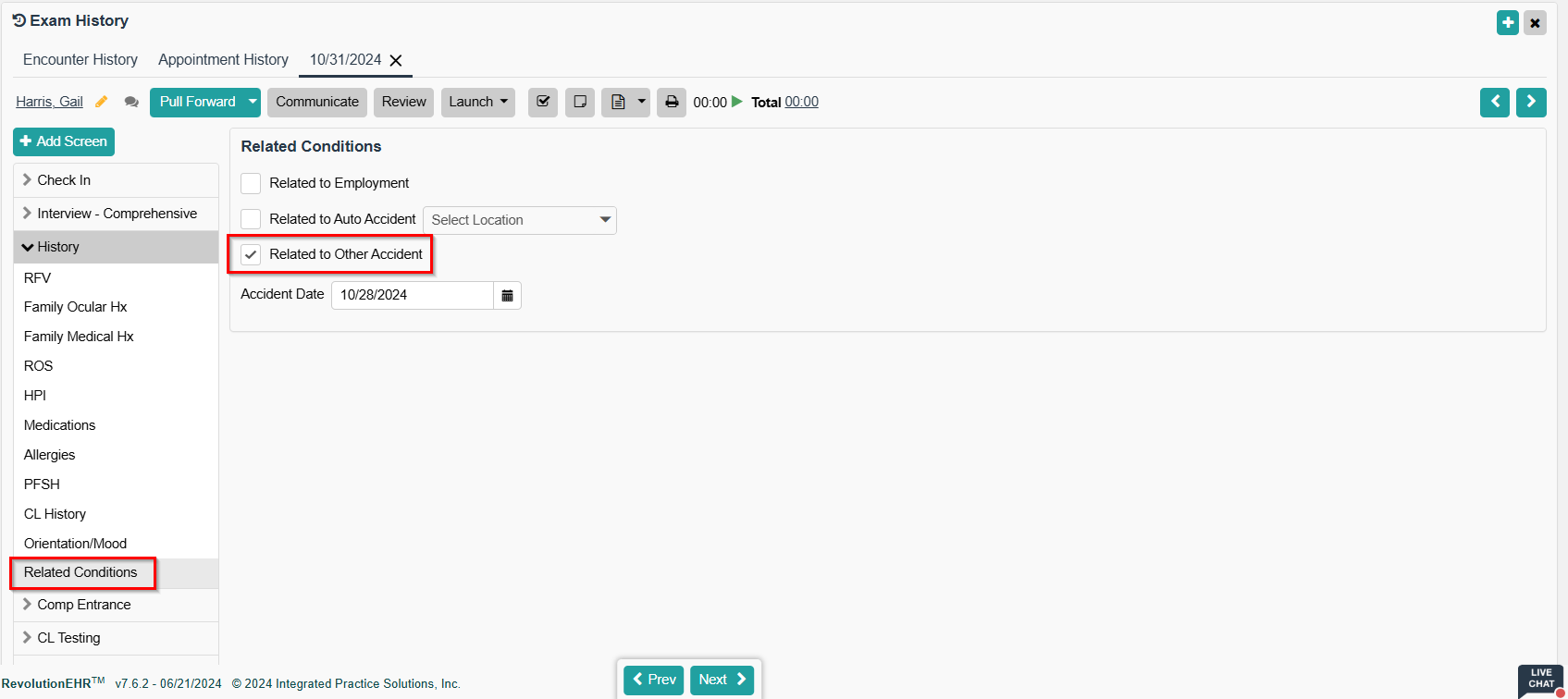 Practices have the ability to create encounter screens and workflow steps with unique names. Thus, the screen name for Related Conditions, noted below, is the default screen name in RevolutionEHR.