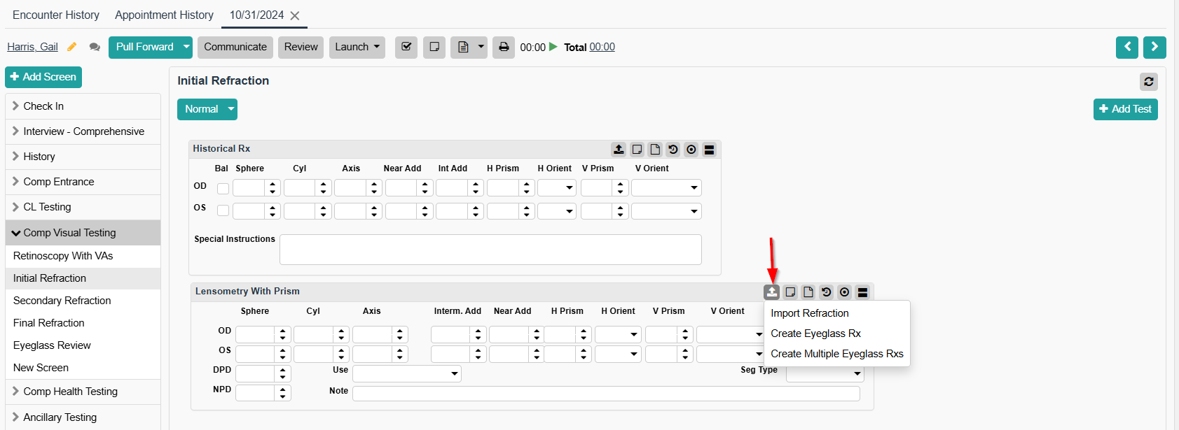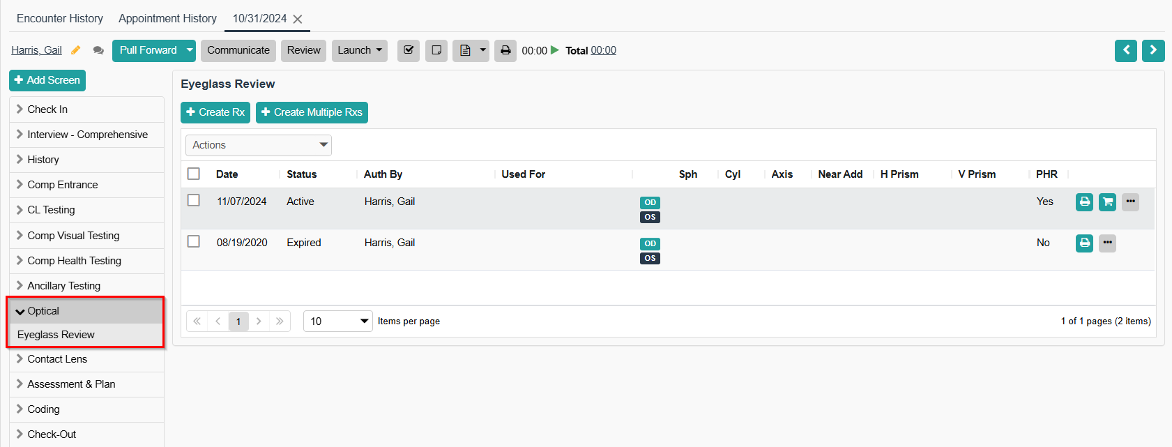 - Open an encounter > Eyeglass Review.