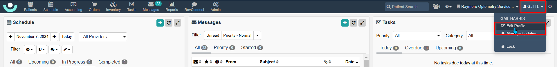 An employee's profile is setup within the Admin module when the practice begins using RevolutionEHR. The system administrator, and any other user profile that is provided access to Admin, can update the employee's information. Employees can update their information by using Edit Profile.