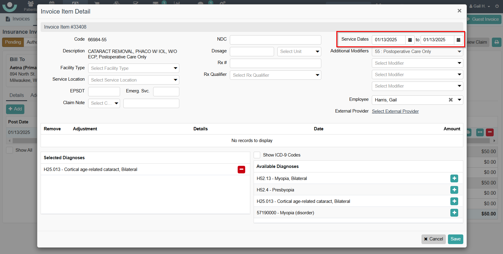 - In the Invoice Item Detail screen, input Service Dates. Note: There are two date fields, both fields must be completed. See Example