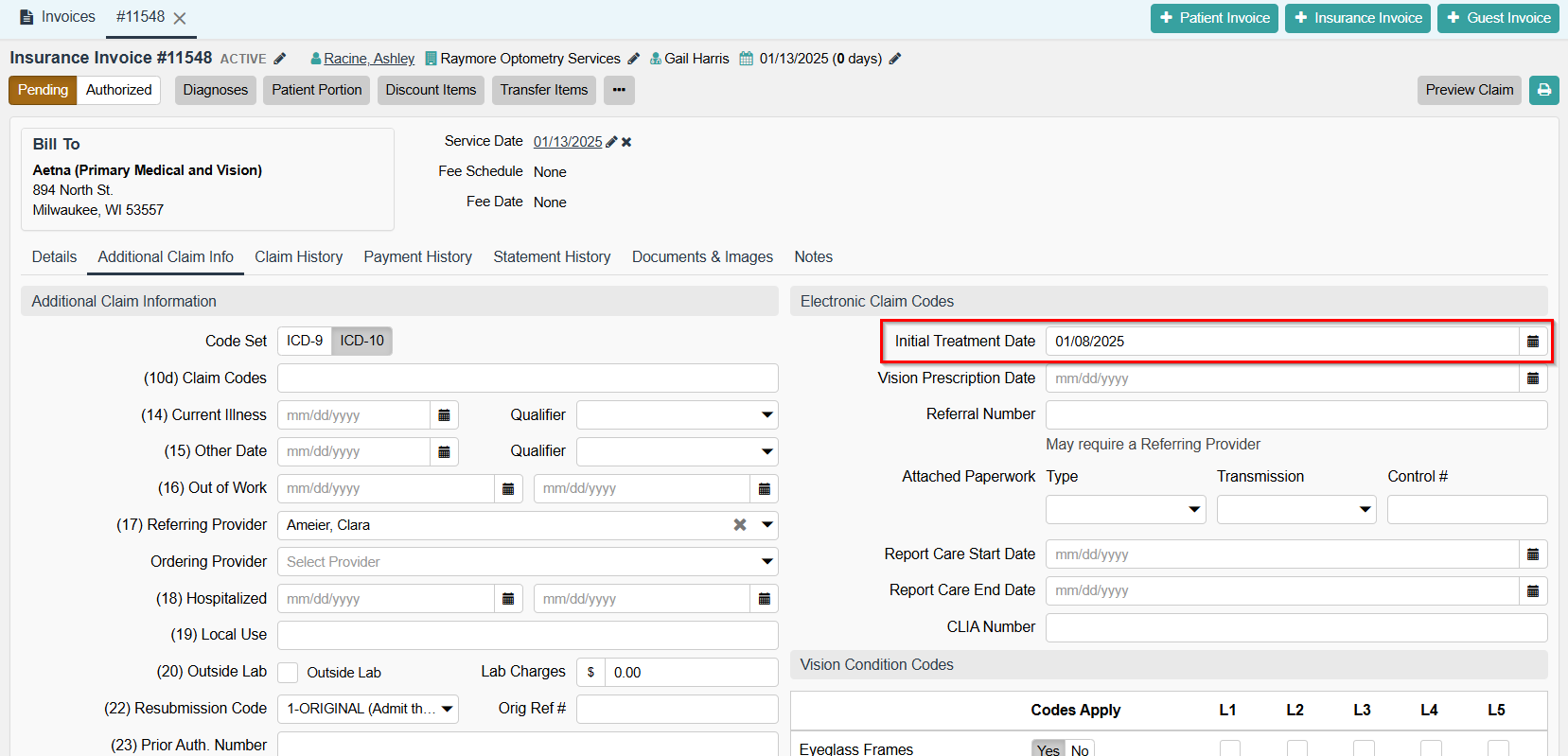 - Access the Additional Claim Info tab, in the Initial Treatment Date field, located in the Electronic Claim Codes section, input the surgery date. See Example