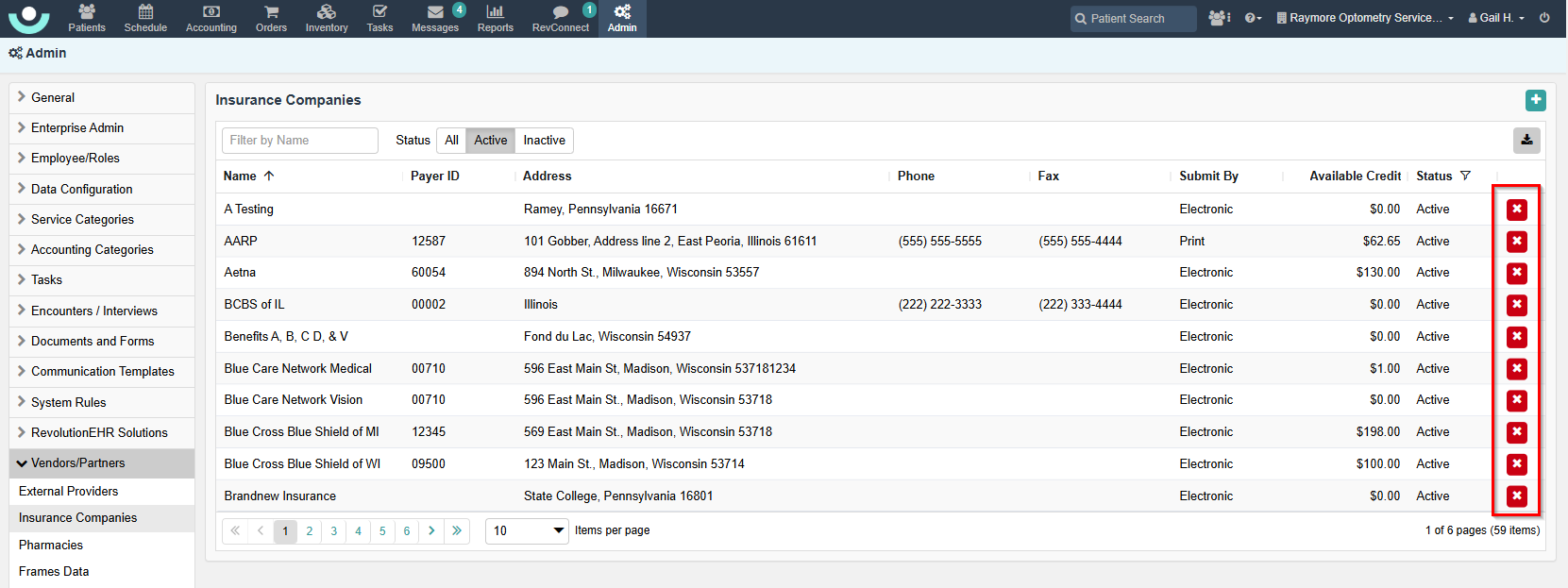 The list of insurance companies comes directly from your RevolutionEHR environment, review your current list in RevolutionEHR > Admin > Vendors/Partners > Insurance Companies and update as necessary. This includes deactivating records as appropriate. See Example