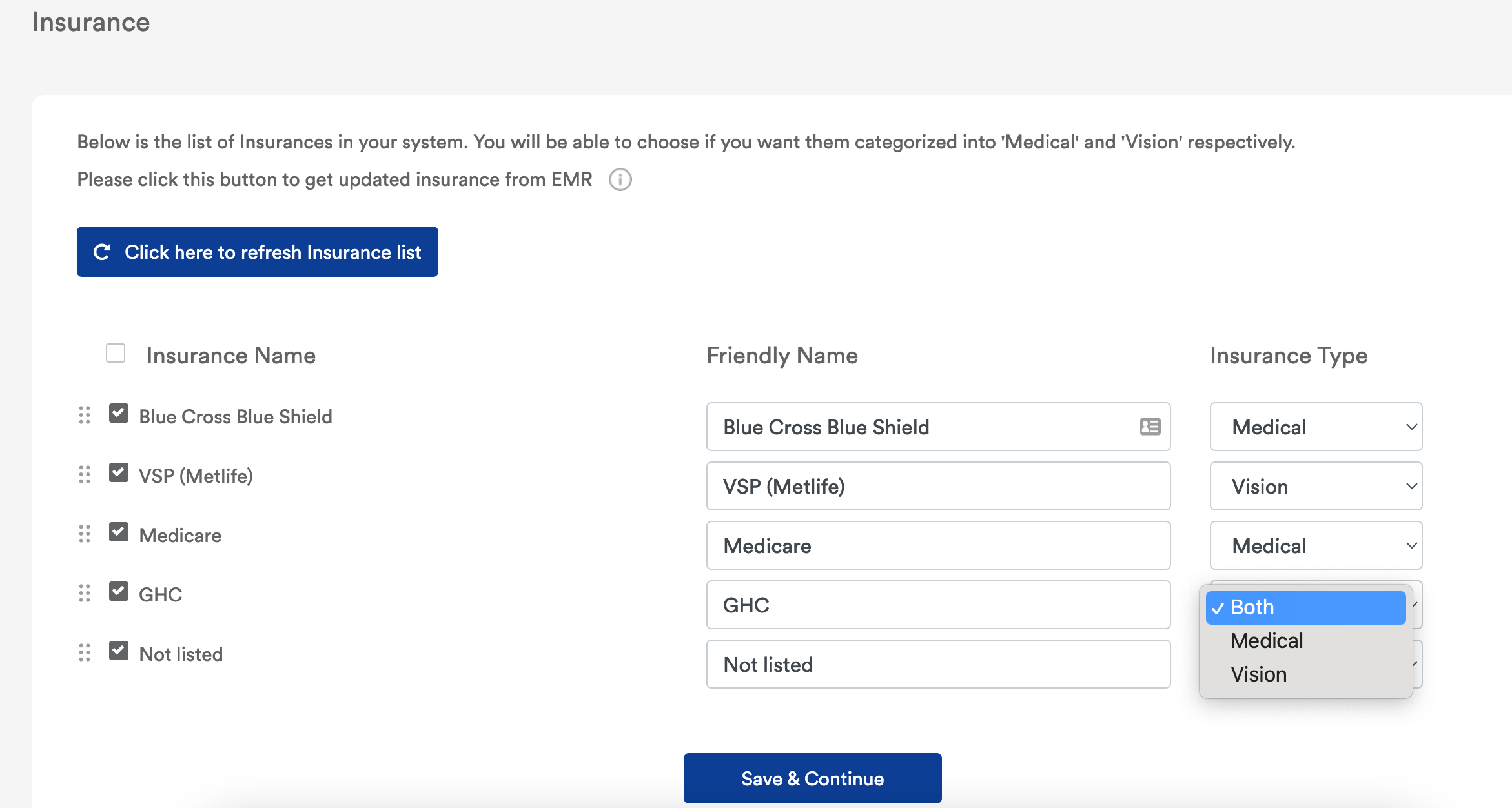 From the Insurance screen, click the refresh button, and select the insurance company names you would like to display. Ensure they have a patient friendly name, and indicate if they are Medical, Vision, or Both. Reorder this list by drag and drop using the ellipsis icon to the left of the name. See Example