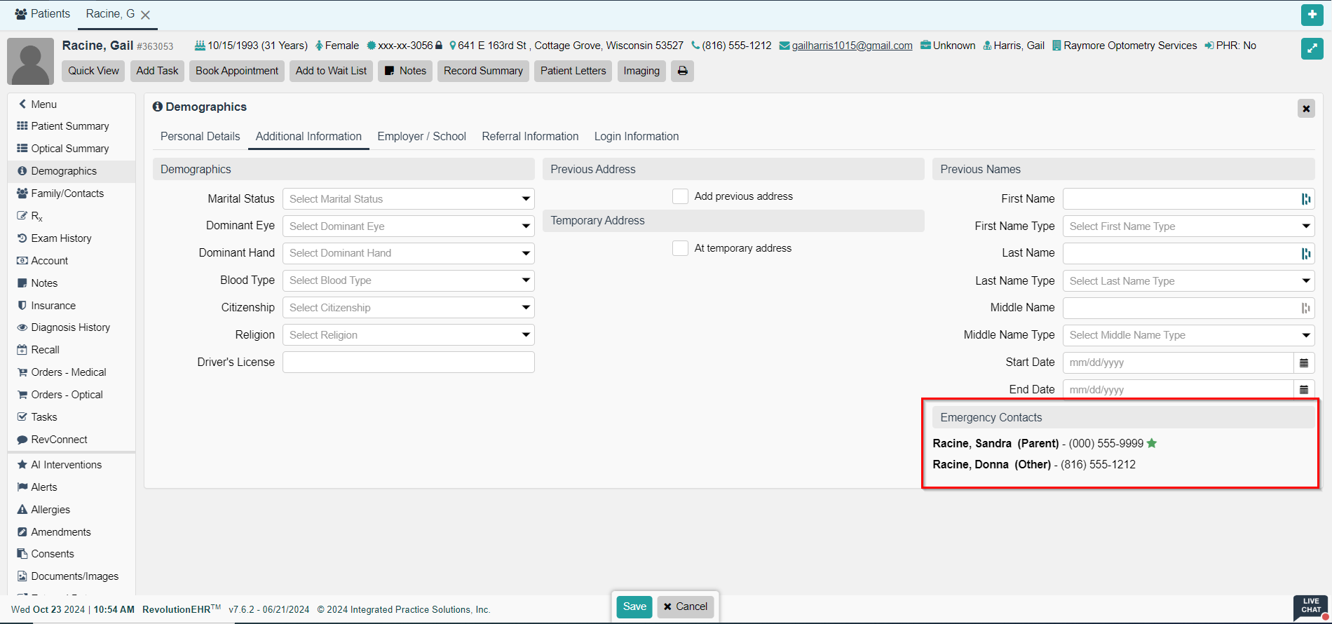 Emergency contact information is displayed in the Demographics component. Access the patient's file > Demographics > Additional Information > Emergency Contacts. See Example