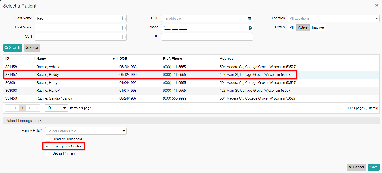 - In the Select a Patient modal, search for the patient that will be the emergency contact.