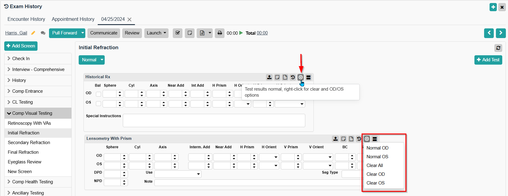 Tests within an encounter include a Normal button within the test's header bar. Right click the Normal button to view a list of options to select such as Normal OD, Normal OS, Clear All, Clear OD, and Clear OS. See Example