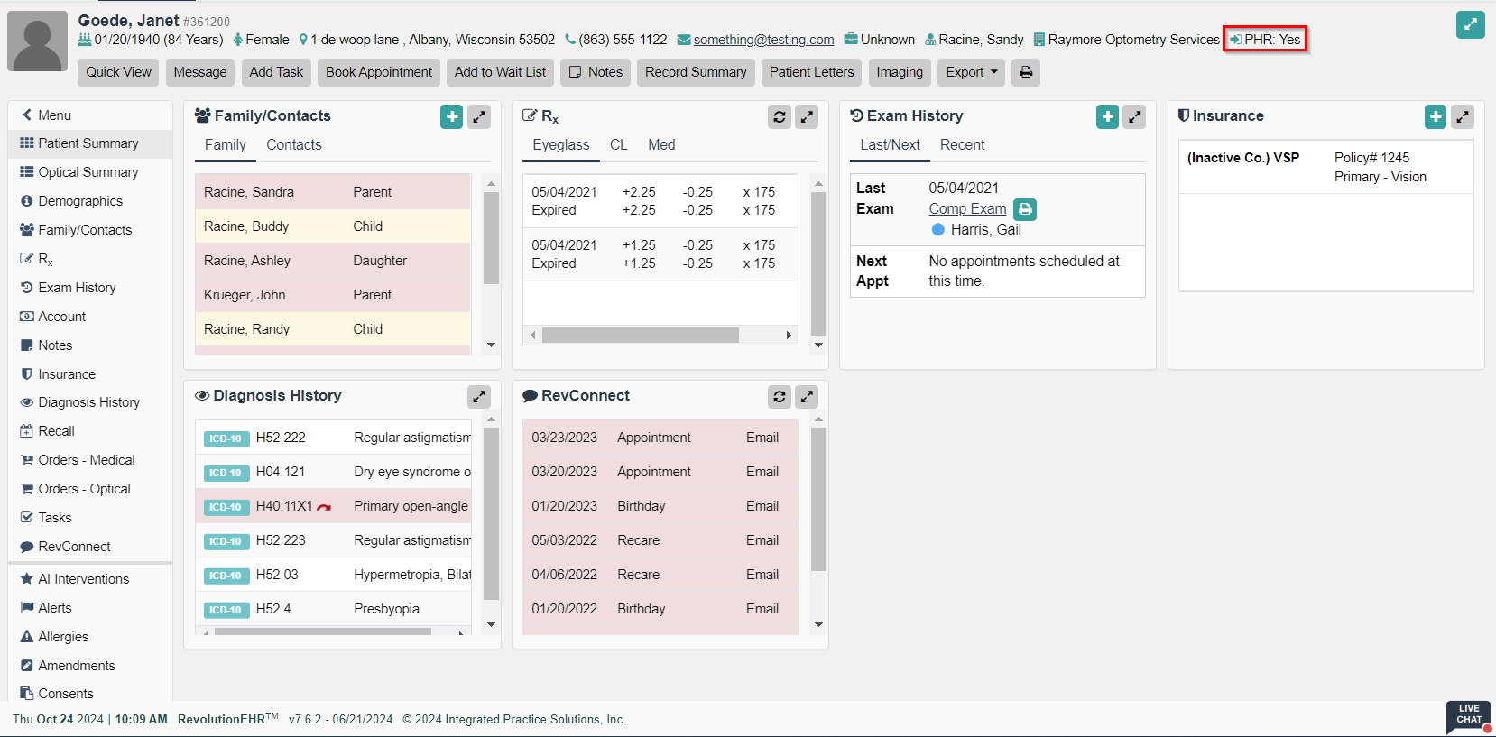 - Within the patient's file header, once a patient has been provided access to RevolutionPHR, "Yes" will always display beside PHR, even after their access has been removed. See Example