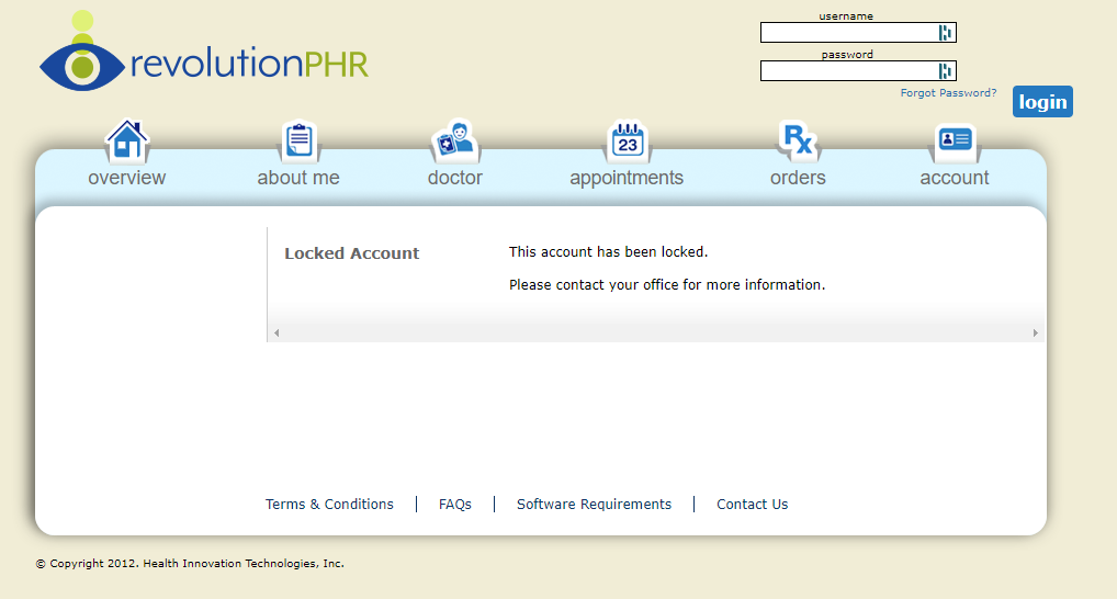 - If the patient attempts to login to RevolutionPHR after their access has been removed, a message displays indicating their account is locked and to contact the office. See Example